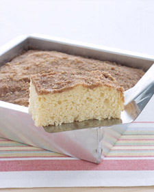 Spoon batter into the prepared pan, and smooth the surface. Pour melted butter over the top. Sprinkle reserved crumb mixture evenly over the butter. Bake the cake until a toothpick inserted in the center comes out clean, about 35 minutes.